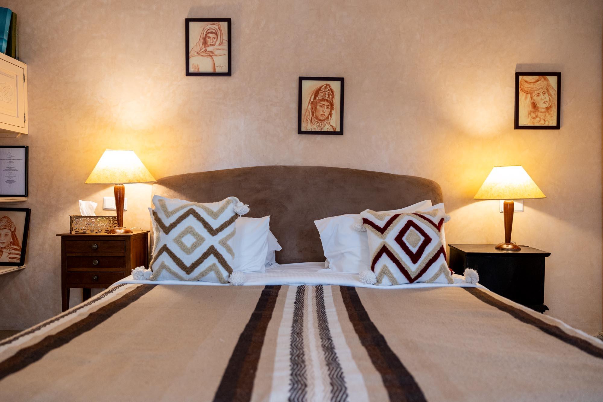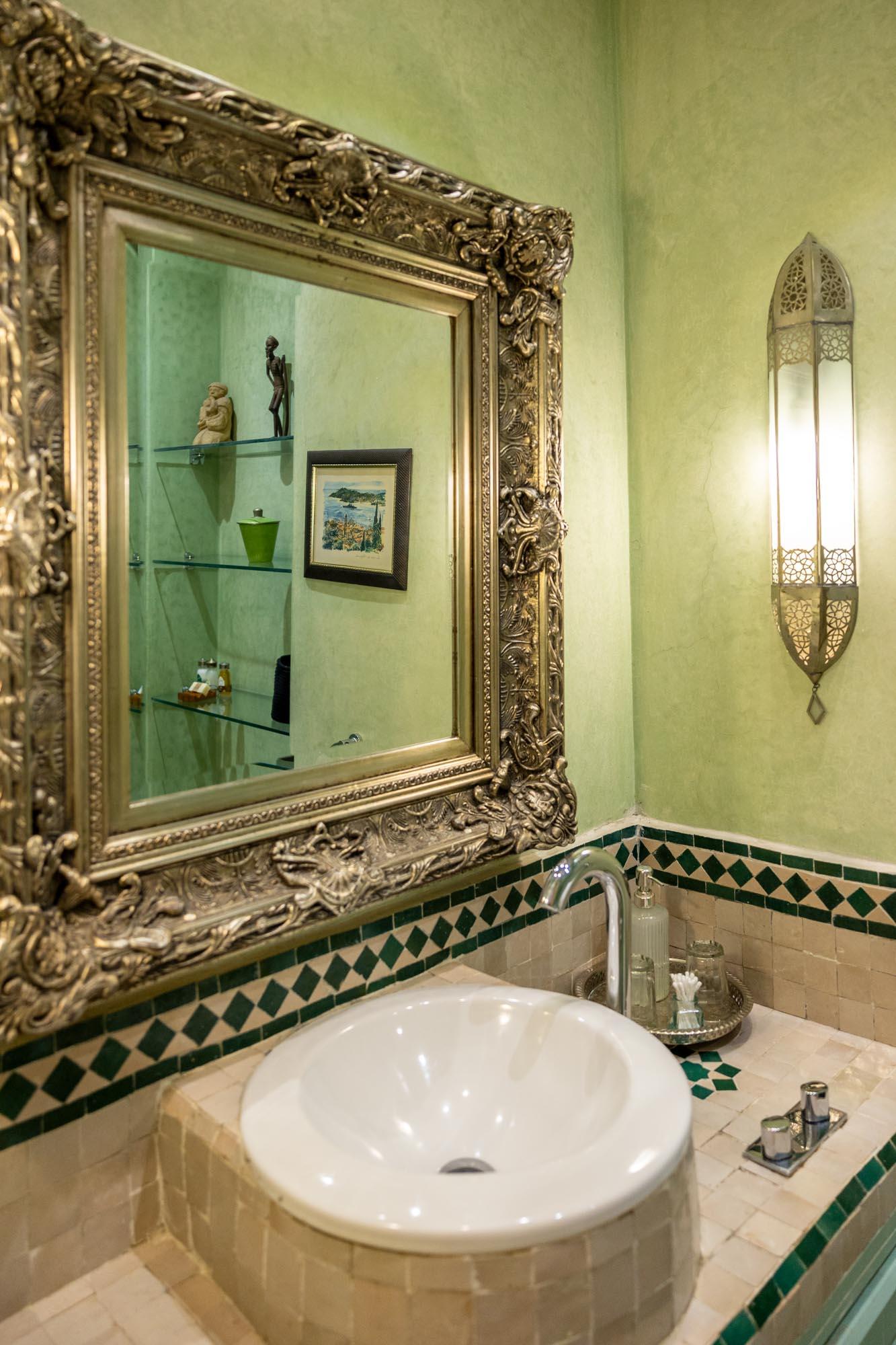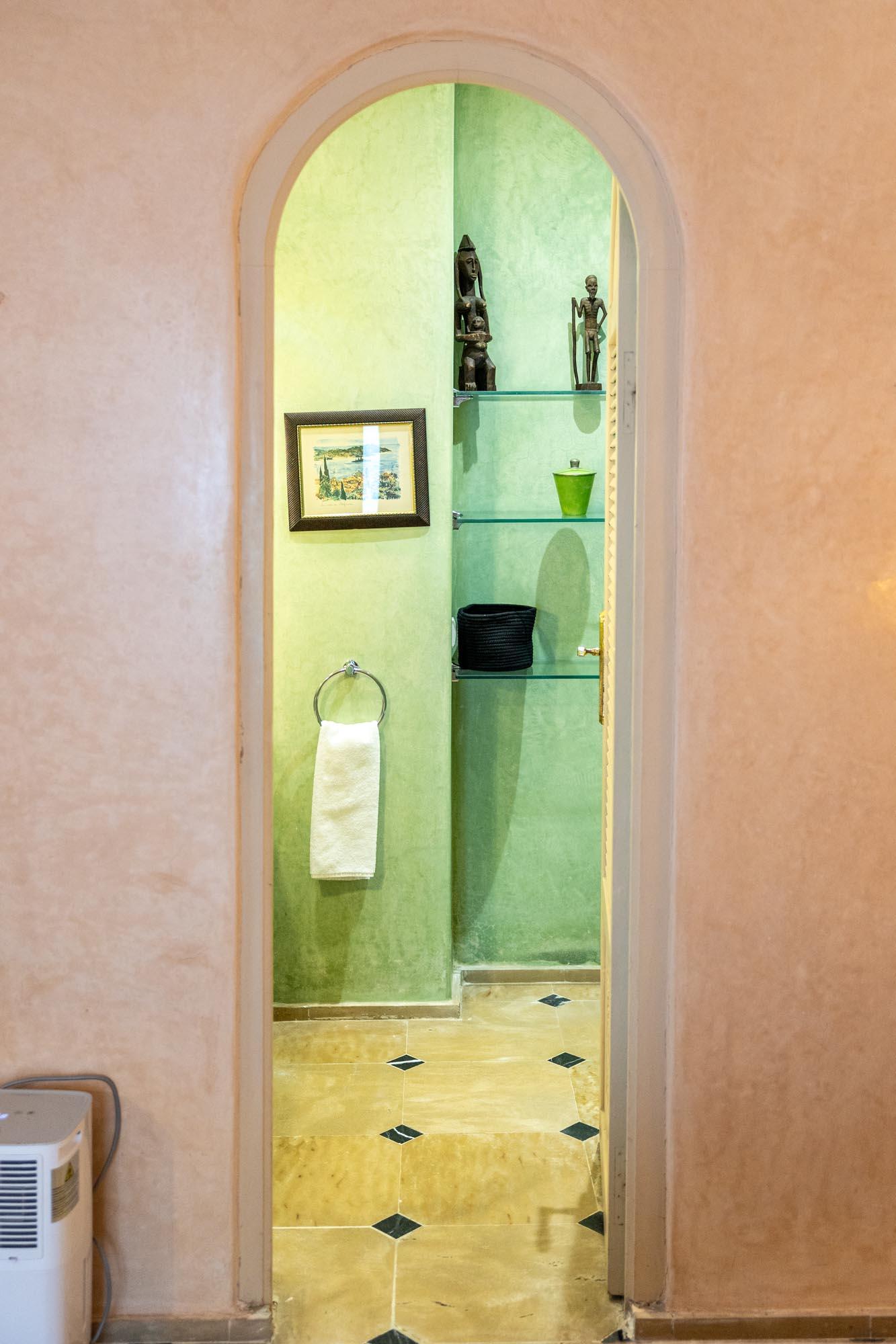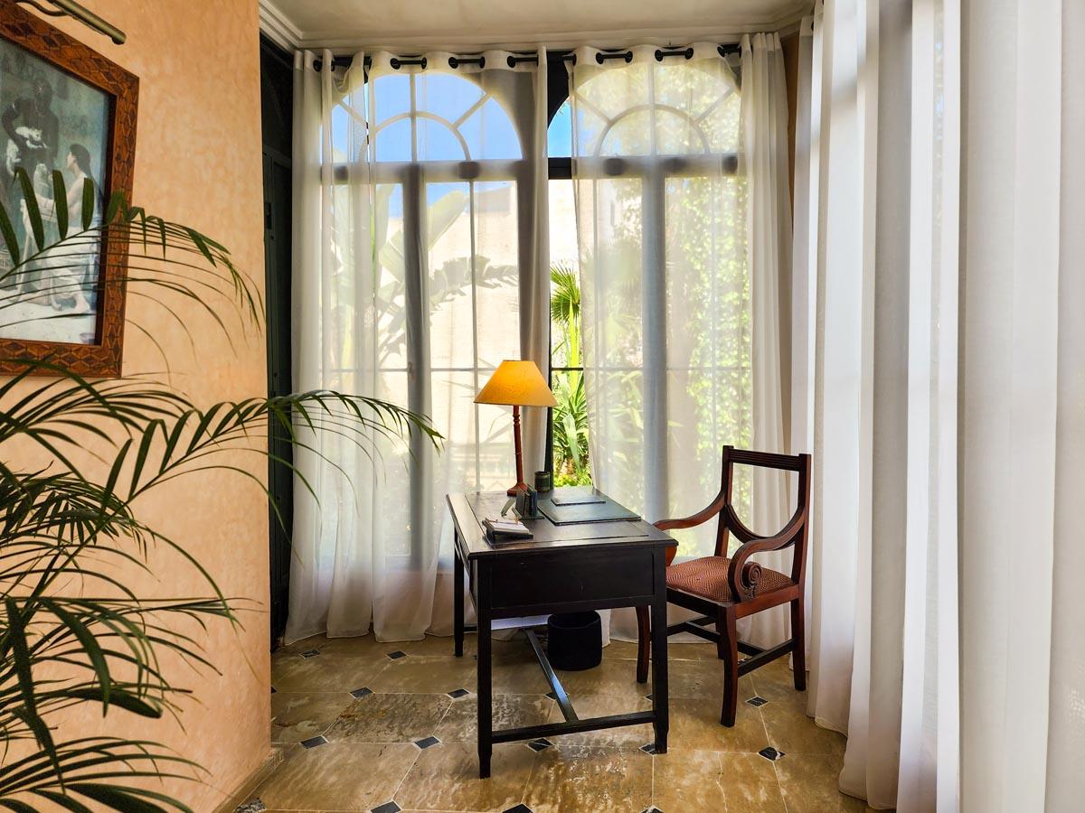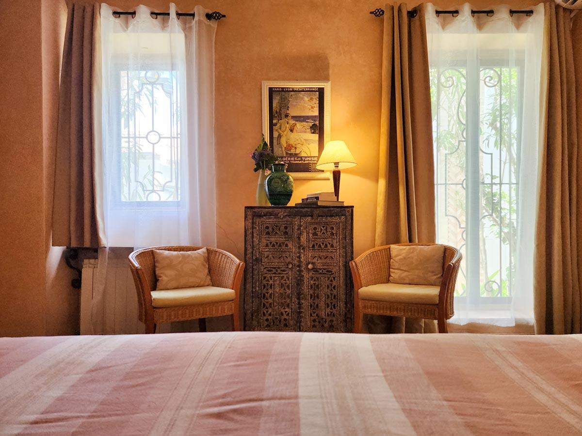 On the guesthouse ground floor, is the first bedroom, onto the garden and swimming pool. This spacious, 25m² room is decorated in a new Moroccan style, enhanced with natural tones, offering a spectacular view of the luxuriant garden. The bathroom is fitted with a bathtub and a shower. A reversible air conditioning, and a safe are available in this room.