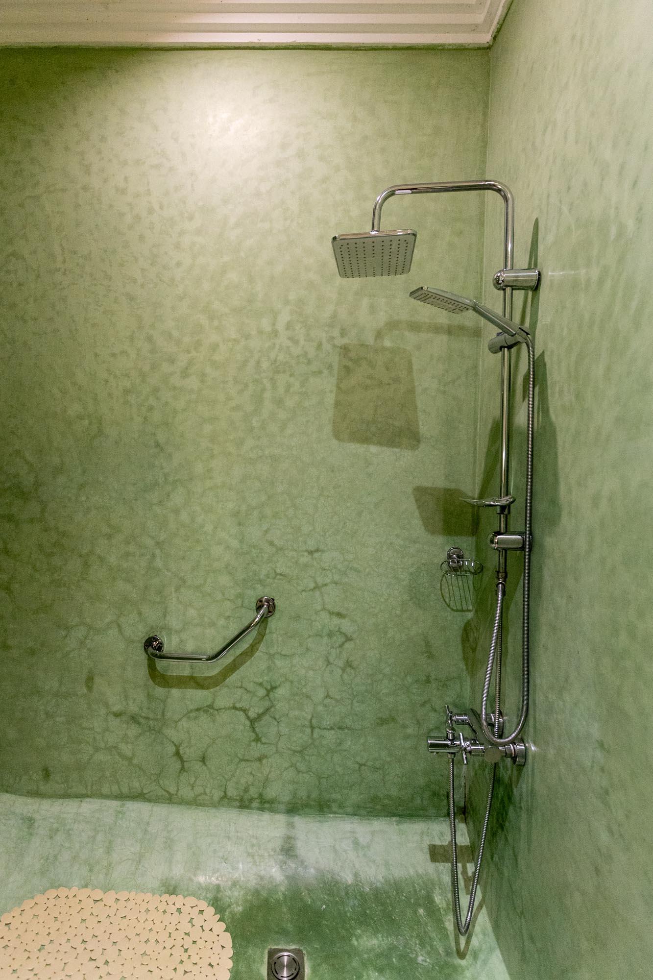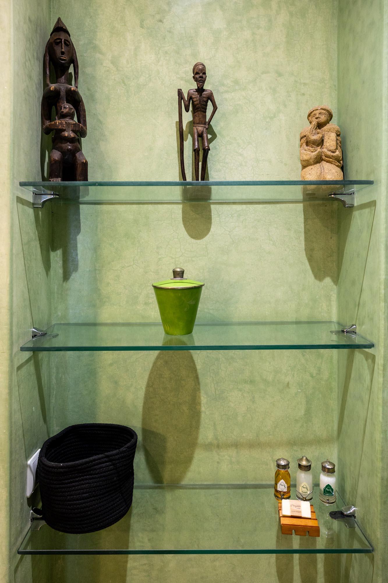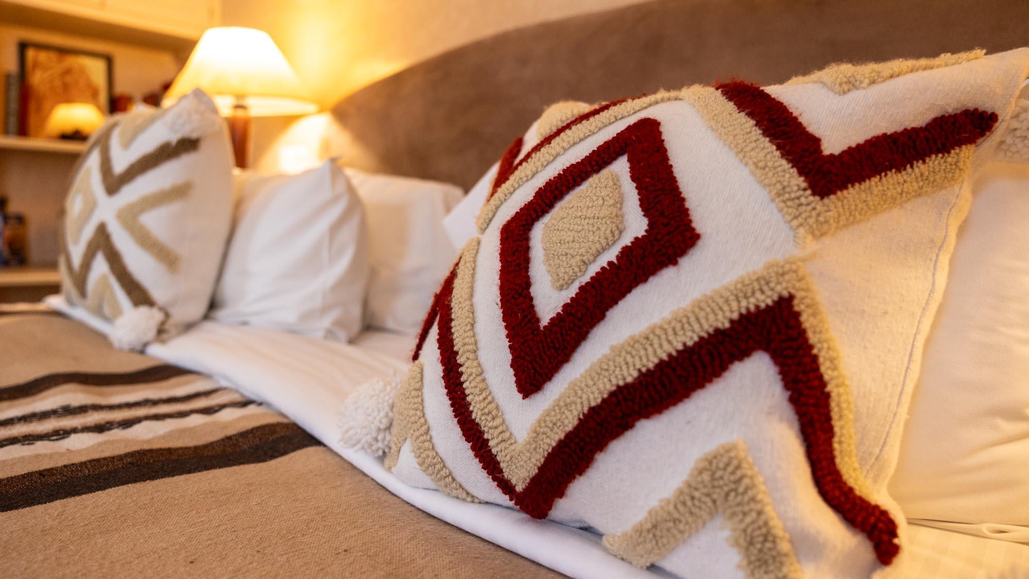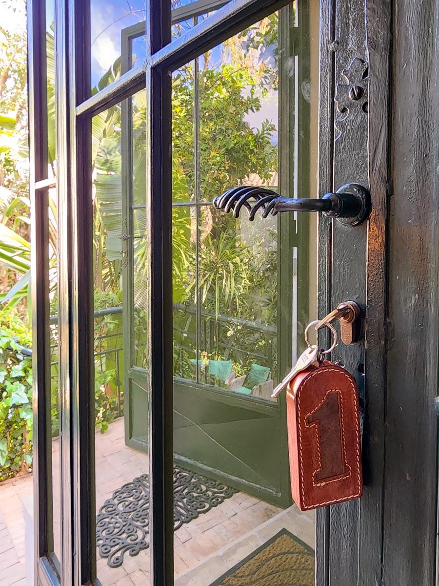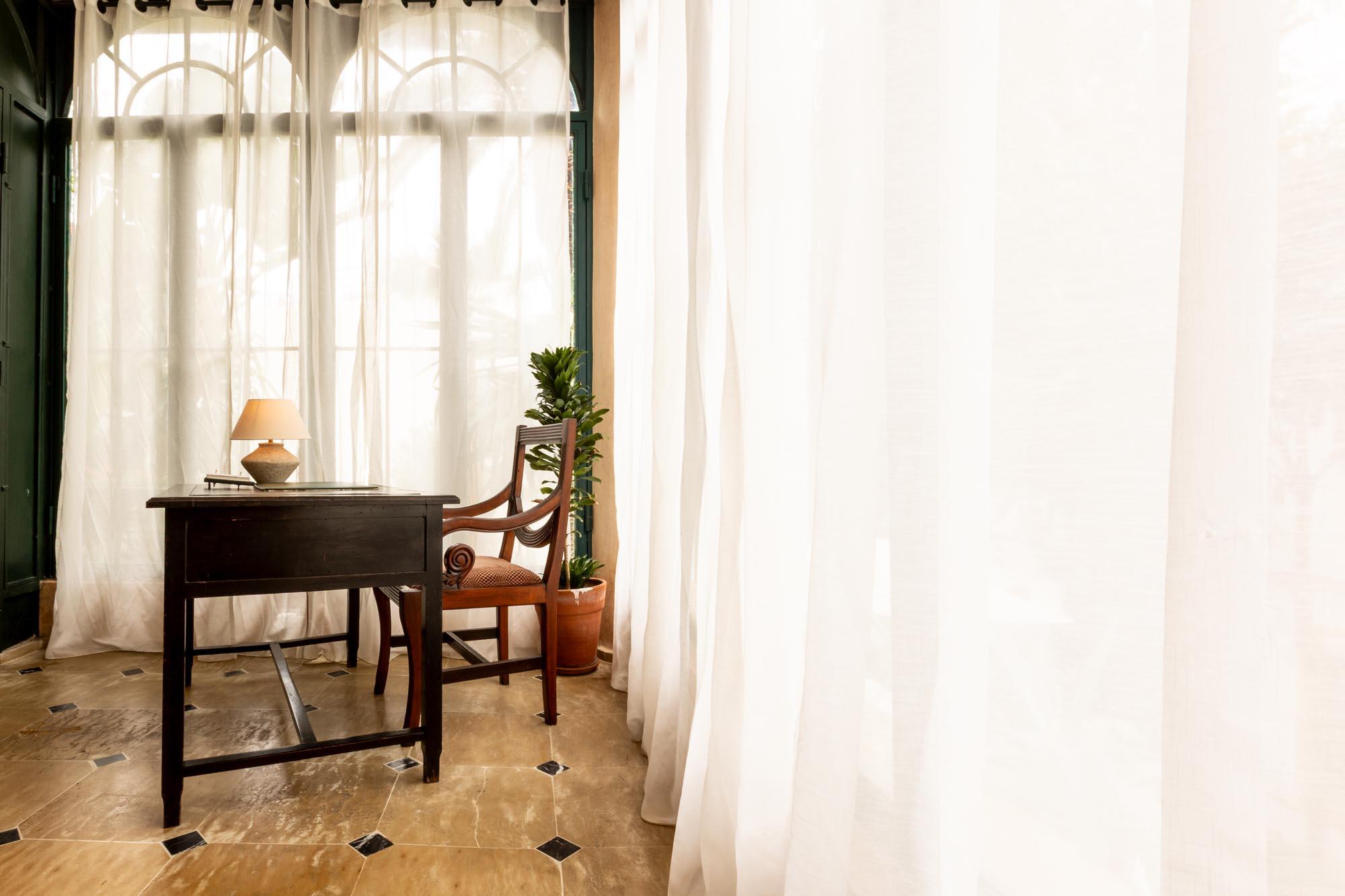 On the guesthouse ground floor, is the first bedroom, onto the garden and swimming pool. This spacious, 25m² room is decorated in a new Moroccan style, enhanced with natural tones, offering a spectacular view of the luxuriant garden. The bathroom is fitted with a bathtub and a shower. A reversible air conditioning, and a safe are available in this room.